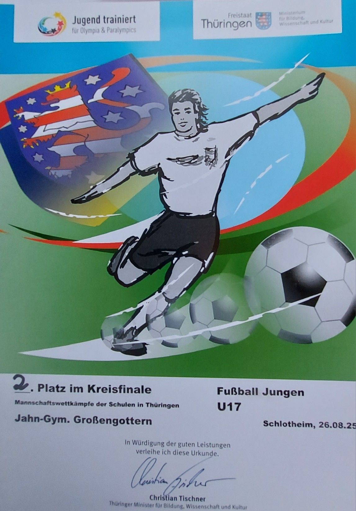 Dabei wurden auch Lorenz Wartmann für das Erreichen des 5. Platzes bei den Deutschen Meisterschaften in Dresden sowie der Landessiegertitel für ein Geschichtsprojekt unter Leitung von Herrn Schwartzkopf ausgezeichnet.
