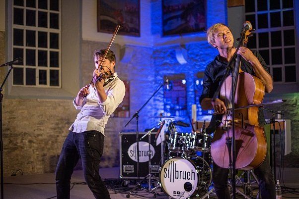 Im unmittelbaren Anschluss begann die europaweit bekannte Leipziger Band "Stilbruch" mit den Mitgliedern Sebastian Maul (Gesang und Cello), Antonio Palanovic (Geige) sowie Konstantin Chiddi (Schlagzeug) ihre eindrucksvolle Performance. Präsentiert wurden uns vorrangig selbst komponierte deutsche Rock- und Poplieder. Ausschließlich auf diesen drei klassischen Instrumenten vorgetragen und durch Gesang abgerundet. Die Motive und Inhalte einiger Songs wurden vorgestellt. Das Publikum zu Klatschen, Tanzen und Mitsingen einzelner Passagen motiviert. Die Lieder wirkten teils energisch und ausdruckvoll, teils emotional und nachdenklich, aber nie langweilig oder schwermütig. Die Klänge der Streicher waren mitreißend, was ich an mir selbst, aber auch an der Reaktion der übrigen Gäste spüren konnte.